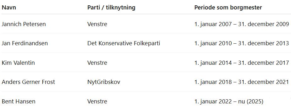 Home / Politik / Gribskovs borgmestrePolitikGribskovs borgmestreAf ViGlemmerIkke Ingen kommentarerjanuar 8, 2025 06:43 Siden kommunesammenlægningen, har der været følgende borgmestre i Gribskov Share this content: Share ArticleTagget:featuredPrevious ArticleFakta om Gribskov kommune og kv2025Next ArticleOpstillede partier KV2025 GribskovViGlemmerIkke Related Posts Se borgernes folder om valget oktober 6, 2025 Kommunalvalget 2021 januar 8, 2025 Kommunalvalg 2025 januar 8, 2025 Skriv en kommentar Annuller svarDin e-mailadresse vil ikke blive publiceret. Krævede felter er markeret med *KommentarNavn * E-mail * Websted Gem mit navn, mail og websted i denne browser til næste gang jeg kommenterer. Δ
